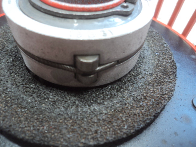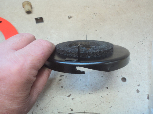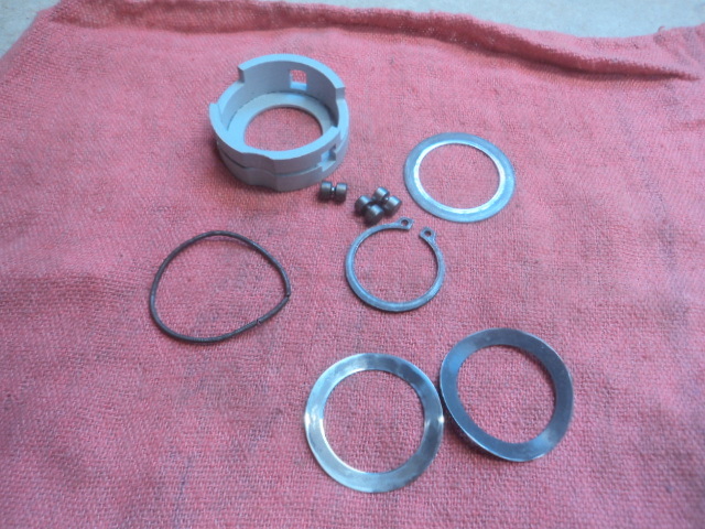 Now you can clean up all the pieces. I like to sandblast the aluminum housing and paint it. Check the condition of the aluminum roller cage, rollers and spring. Clean up as needed. Check the 3 roll pins in the aluminum housing. They should be sticking inward the thickness of the spring housing so that it properly seats in the slots of the housing. If the slots are badly worn, you need to replace or fix it somehow. If the sponge dust seal is loose, you can glue it back on. If it is gone, you can make another or just go without it.