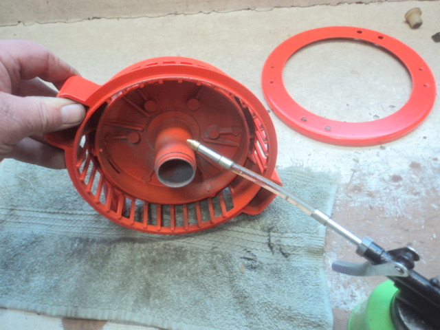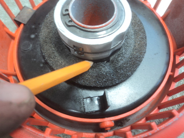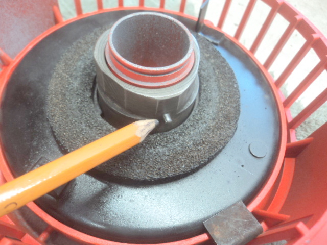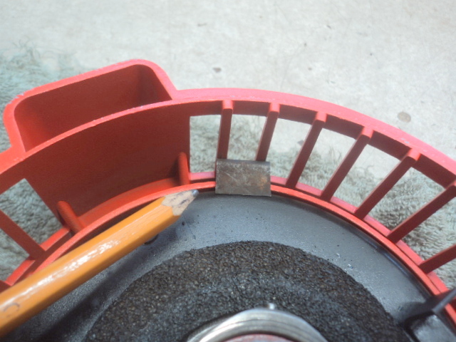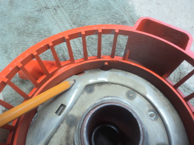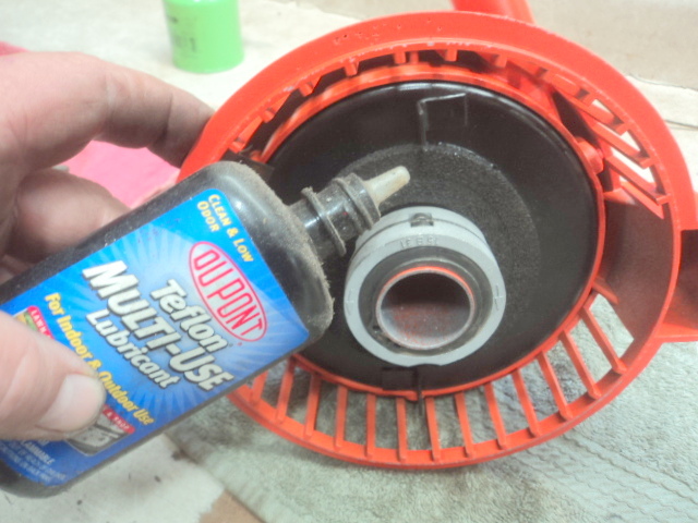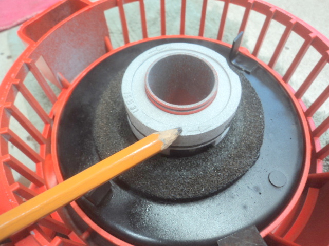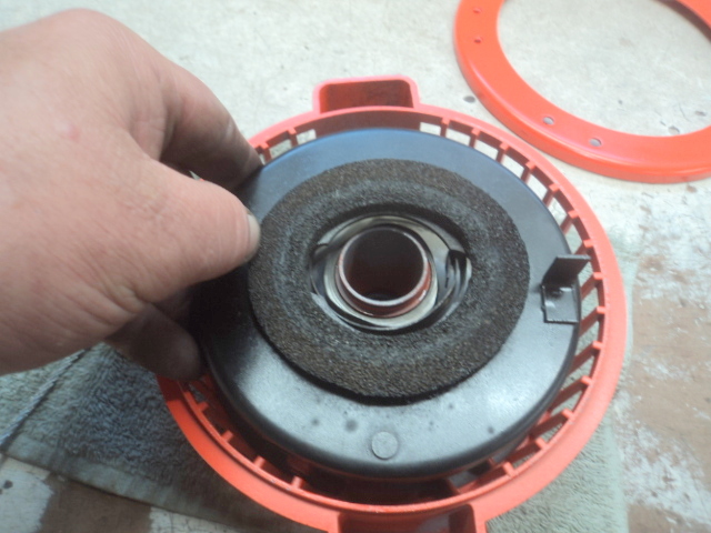 Now your recoil is back together. It should pull out and retract smoothly. If over time the spring does not retract well, you can spray some dry lubricate into the recoil housing without pulling the assembly apart. See where the pencil points below. When complete, your cable should stick out as shown when fully retracted.