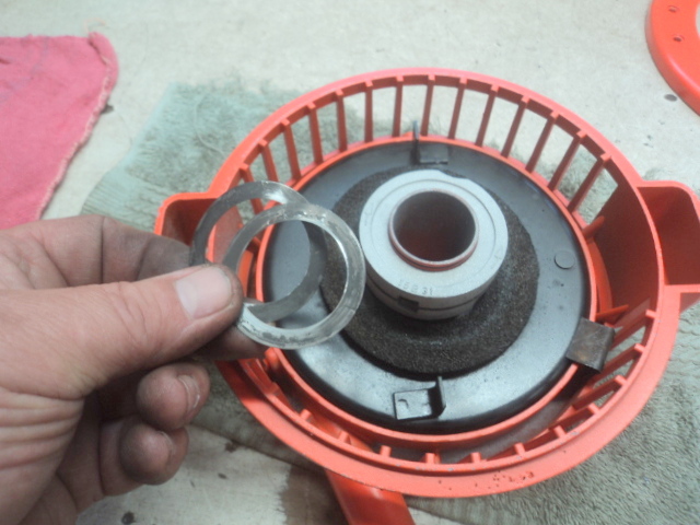 Install the two beveled washers onto the cage with no lubricant and install the snap ring. These beveled washers act like a brake and hold back the aluminum cage so the roller pop out when you pull the recoil. If the recoil seems too tight and won’t retract, you can add a little more spring tension by turning the spring housing another third of a turn or two. Sometimes, only one beveled washer is needed. Do not over tighten the spring or it will bottom out when you pull the recoil cable.